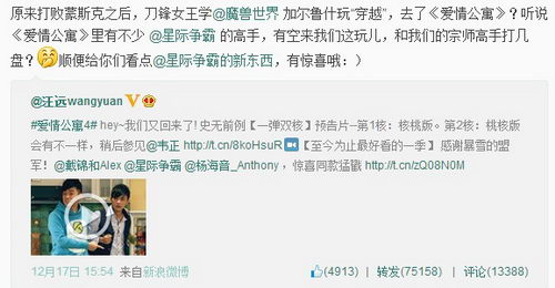 《爱情公寓4》制片人汪远在微博上把新预告片转发给暴雪中国总经理戴锦和后,戴总迅速接招:“听说《爱情公寓》里有不少星际高手,有空来我们这玩儿,顺便给你们看点的新东西。”