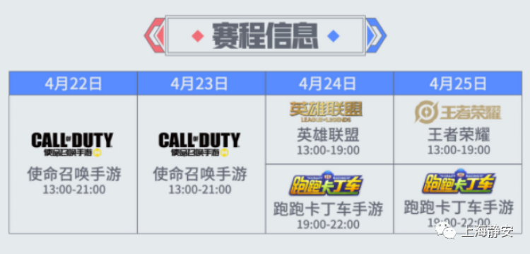 从当天起至4月25日,共四天赛程里,《英雄联盟》《王者荣耀》《使命召唤手游》《跑跑卡丁车手游》四个比赛项目接力登台,带来一场场令人热血沸腾的电竞盛宴。