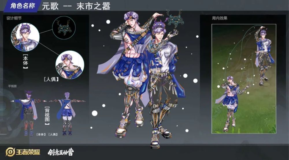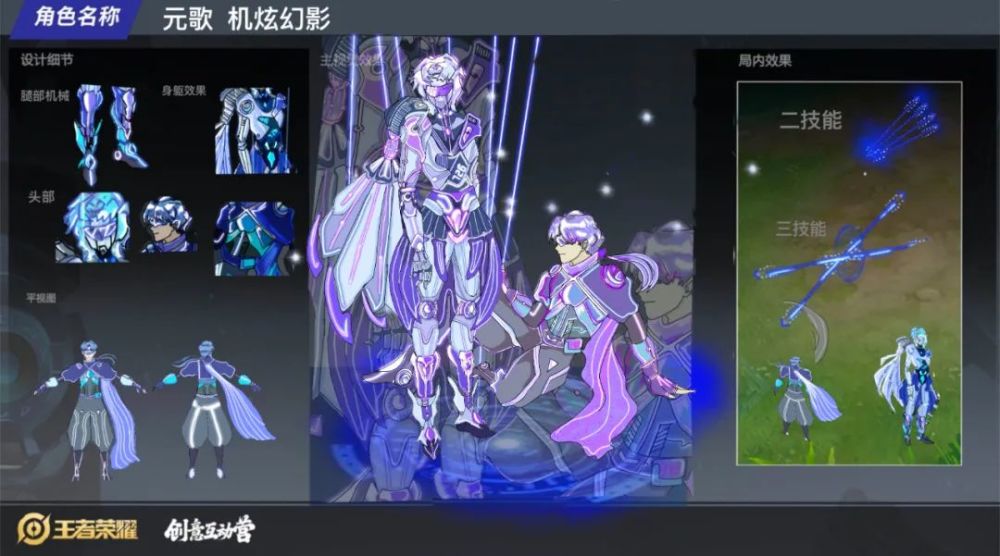 机炫幻影这款皮肤,讲述的是少年元歌在星空中创造,自己的故事。这款皮肤中带有许多星空梦幻元素,色调以蓝紫色为主,可以说浪漫气息十分浓厚。