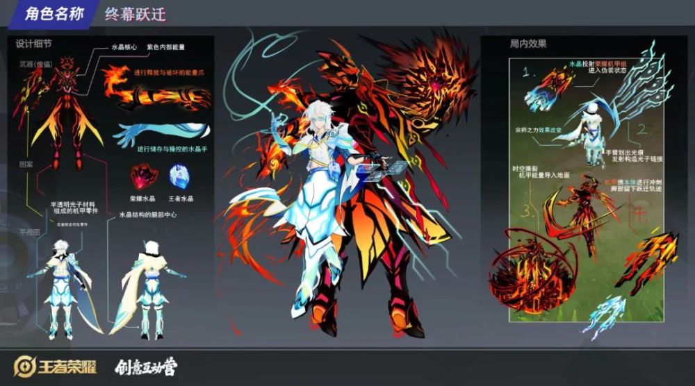 终幕跃迁同样是、机甲主题风格的皮肤,讲述的是王者峡谷动荡,出现代码故障的元歌使用王者水晶建造新的机甲。这个皮肤风格颜色如火,非常明烈。
