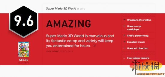 总评:《超级马里奥:3D世界(Super Mario 3D World)》可谓出类拔萃,而且它梦幻的多人合作玩法和丰富多彩的内容可以让你开心很久。