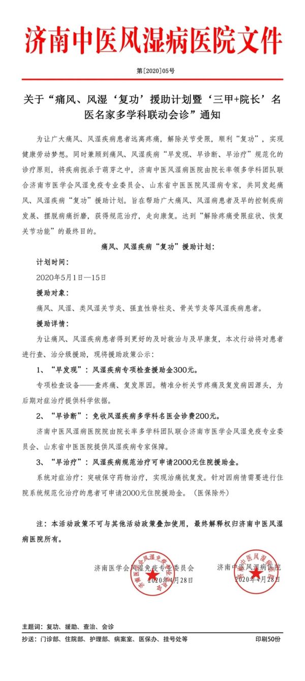 自进入5月以来,我院院委会领导便联合济南医学会风湿免疫专业委员会、山东省中医医院专家发起痛风、风湿“复功”援助计划。
