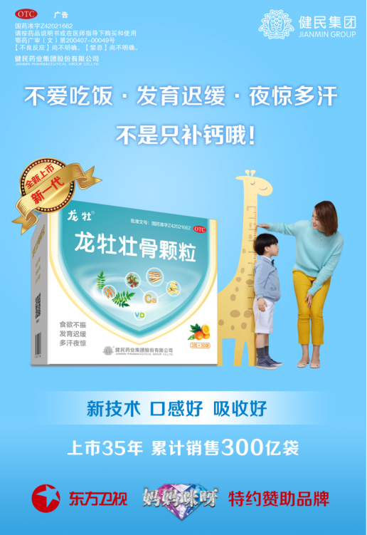在关注儿童健康成长方面,健民龙牡壮骨颗粒有着丰富的经验。1985年,健民集团结合中西医学推出龙牡壮骨颗粒,开始发展国内小儿补钙产品市场。目前龙牡已入选国家一级中药保护品种,被国家卫计委列入“中药儿童用药示范品种”,并深受家长们的喜爱。近年来健民集团不断通过工艺优化促进产品升级,提升产品品质,新一代龙牡壮骨颗粒不但可以补充钙和维生素D,同时其中药成分也能够调理儿童脾胃,促进日常饮食中蛋白质、脂肪和糖类三大营养素全面吸收,促进骨骼健康发育,增强抵抗力提高免疫力,让小身板蹿成大个头。