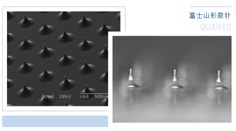 据了解,Quanis采用了,的建模工艺,这种生产工艺保证了微针长短相等、密度相同,所形成的富士山形微针底座的面积更大,能更强有力地、精准地穿透角质层,进入真皮层。