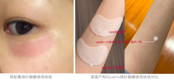 某国产微针眼膜使用后也出现皮肤红肿的情况,说明产品有一定刺激性和致敏度,再加上微针原本的小山包形,虽然,部分可以扎入皮肤,但由于针尖粗大还是会造成肌肤红肿。