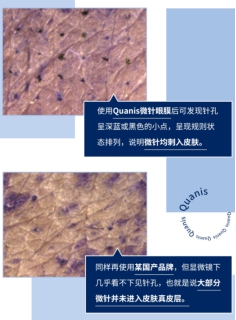 使用Quanis微针眼膜后可发现针孔呈深蓝或黑色的小点,呈现规则状态排列,说明微针均刺入皮肤;同样再使用把某国产品牌,但显微镜下几乎看不下见针孔,也就是说大部分微针并未进入皮肤真皮层。