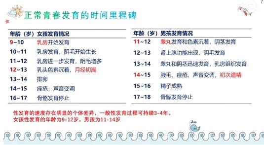怎么知道孩子是性早熟呢?孩子几岁发育算正常?一是看孩子的年龄,二是孩子第二性征的发育情况。如果女孩在8周岁前、男孩在9周岁前出现第二性征的发育,这样的情况就属于性早熟。,出现女孩具体表现为乳房增大,男孩具体表现为睾丸容积增大,如果男孩的睾丸变成小山核桃那么大,就表示已经开始性发育了。女孩出现阴毛腋毛、外阴分泌物,男孩出现胡须、喉结、变声等也都可能是性早熟的表现。女孩一般在12岁左右月经初潮,来月经就说明孩子青春期已经到末期了,身高增长的空间不大了。