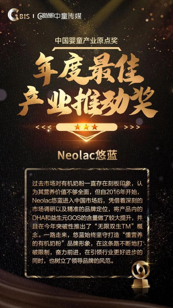 随着国民健康意识的增强,有机婴童产品越来越受消费者青睐。据2020年9月AC尼尔森报告显示,中国有机婴配粉市场增速高达22%。在此趋势下,荷兰高端有机奶粉品牌--Neolac悠蓝与其母公司百年乳企海普诺凯生物科技有限公司一起亮相现场,并以其在有机奶粉领域的杰出表现,在中国婴童产业至高奖项“原点奖”评选中荣获“年度最佳产业推动奖”,备受行业各界关注。