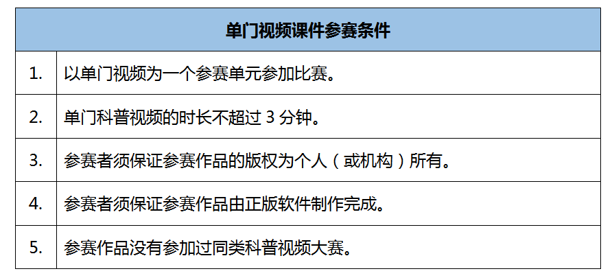 大赛分单门科普视频和系列科普视频两个赛道进行比赛。参赛者以及所属机构,应符合国家法律法规和国家相关政策,经营规范,社会信誉良好,无不良记录,不侵犯任何第三方知识产权。报名时参赛者必须与组委会签订作品版权声明和使用正版软件承诺书。