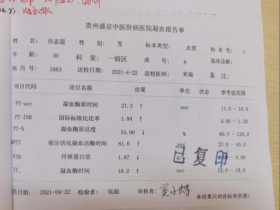 因“乏力、厌油、皮肤黄染20+天,腹胀5天”于2021年4月21日入我院治疗。入院查:血常规:WBC4.20x10⁹/1,HGB107g/1,PLT90x10⁹/L;血型:O型,RH阳性;肝功能:ALT133.5U/L,AST156.1U/L,GGT75.9U/L,CHE5669U/L,TBA270.8umol/1,TB555.0umol/L,DB343umol/L,IB212umol/L,ALB32.8g/1;凝血功能:PT-sec21.3S,PT-INR1.94,PT-%54.90%,APTT81S,FIB1.87g/1,TT18.2S;乙肝两对半定量:HBsAg310.15IU/ml,HBeAb0.002COI,HBcAb0.011COI;HBV-DNA:1.35E4IU/ml;腹部B超:1、肝区弥漫性回声改变2、门静脉增宽3、脾脏增大4、胆囊壁增厚水肿样改变考虑:肝硬化声像表现请结合临床。积极予保肝、降酶、促进肝细胞再生、改善胆汁淤积、退黄、抑酸护胃、维持水电解质平衡、、预防并发症及2次人工肝(血浆置换)等对症支持治疗,患者精神、饮食、睡眠恢复,病情好转出院。