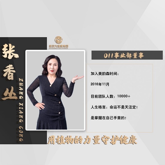 我叫张香丛,今年54岁,来自河北省沧州市河间市,是徽韵大健康集团美韵森011事业部董事,目前团队人数有10000+。