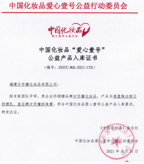经过连续8小时的不间断严苛评审,符合本次“致敬边关·中国化妆品‘爱心壹号’公益行动”捐赠产品入库要求的企业名单最终出炉。其中,福建片仔癀化妆品有限公司所捐赠品牌——片仔癀化妆品(片仔癀牌清盈焕白假日防晒乳、皇后牌片仔癀珍珠膏),通过安全性、功效性考核,符合中国化妆品爱心壹号公益产品入库要求,成功入选。片仔癀化妆品方将捐赠200瓶清盈焕白假日防晒乳和200瓶皇后牌片仔癀珍珠膏给新疆戍边战士,助力本次公益活动,产品将由“致敬边关·中国化妆品‘爱心壹号’”公益车队送到边关战士们手中。