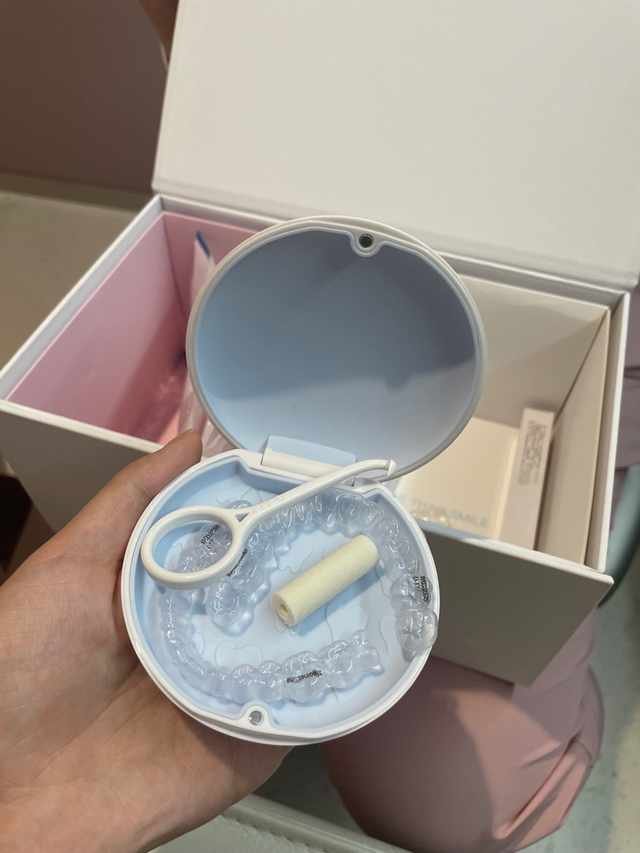 我之所以选择笑研所,就是因为害怕做完正畸反而不好看了,因为很多医院正畸更关注的是牙齿的整齐和使用,但笑研所全方位涵盖骨骼和完成后的美观,我这么爱美,一定选做完以后,看的方案嘛。确定方案后,医生团队会在一周后给出详细的精确方案,并且你会得到第一套隐形牙套和微笑礼盒。它里面包含了1个矫正器收纳盒,1支唇膏、一个咬胶、1个摘取器。最让我惊喜的是,第一个阶段的12副牙套戴完了还可以再来领取新的,非常人性化。