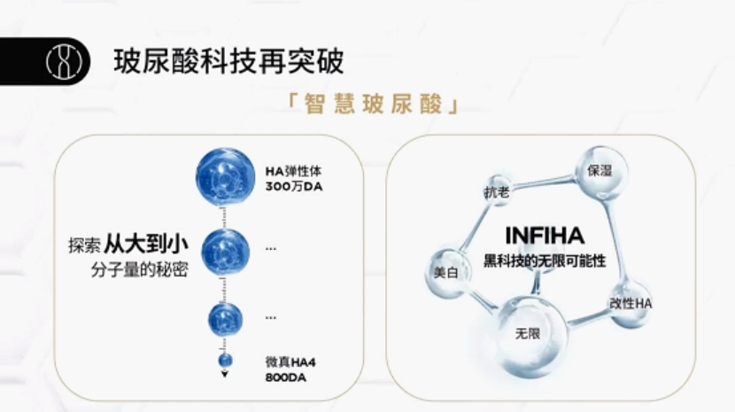 润百颜第3代水润次抛精华进行了全面的科技升级,,应用了华熙生物微真HA4和润百颜,黑科技INFIHA-HYDRA。其中,凭借华熙生物荣获中国专利金奖的「酶切法」,润百颜打破常规实现玻尿酸分子量大小的自由切割,而今年该技术再度突破—“微真HA4”800Da玻尿酸诞生。