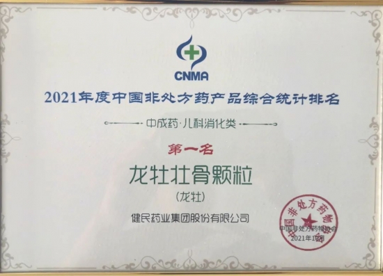2021年10月18日,2021健康中国-首届中国OTC大会暨中国中医药促进大会于广州长隆酒店盛大举行!健民集团钻石单品——龙牡壮骨颗粒,凭借其过硬的产品疗效和良好的市场口碑,荣登“2021年中国非处方药中成药·儿科消化类产品”榜单,并独占鳌头。