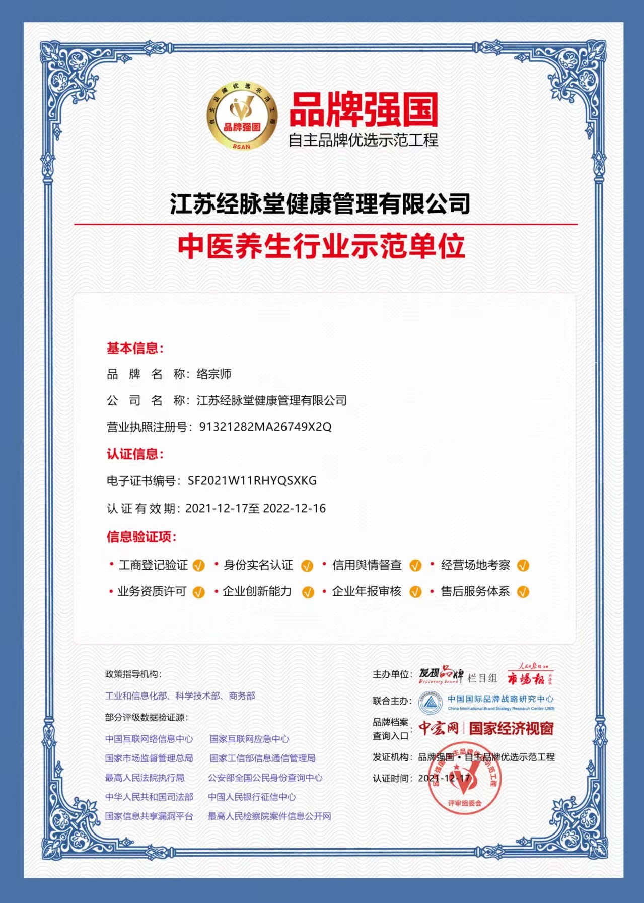 络宗师品牌始终把诚信放在第一位,据悉,在“品牌强国•自主品牌优选示范工程”的评选中,江苏经脉堂健康管理有限公司荣获“中医养生行业示范单位”,同时在2021年度中国企业信用管理中心诚信企业评定中,络宗师被综合评定为《中国315诚信企业》,这也是权威机构对于在创新、诚信、服务等领域做出贡献的优秀企业所颁发的奖项荣誉。这充分体现出了社会各界及广大消费者对络宗师品牌服务、守诚信品牌形象的高度认可与信赖。