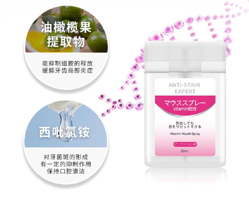 将喷头对准口腔,“滋滋”2~3下,溶液经过高雾化喷头,瞬间到达口腔各角落,不用担心死角没被滋到,往嘴巴里一按一喷,简单操作,就能呵护你的口腔健康,不仅如此,嘴都是满满蜜桃清香,犹如咬了一口水蜜桃,跟谁讲话都自信满满。