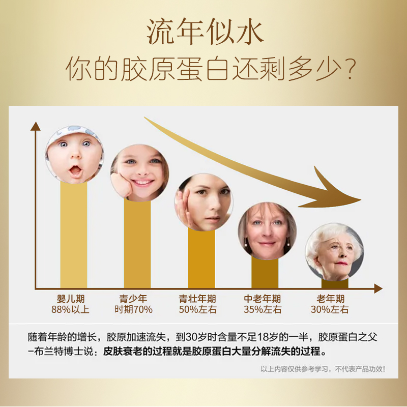 你可能不知道胶原蛋白的流失有多可怕,世界胶原蛋白之父布兰特博士说过:“皮肤衰老的过程,就是胶原蛋白被分解而流失的过程”,,研究也证实了,人体所含的胶原蛋白会随着年龄的增长而逐渐流失。