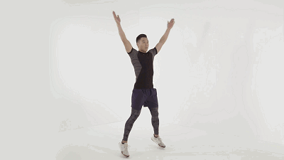 身体站直,两腿前后岔开,身体向上跳跃的时候双手置于头顶并击掌,再次跳跃的时候双手打开成一百八十度的样子,双腿交换位置。