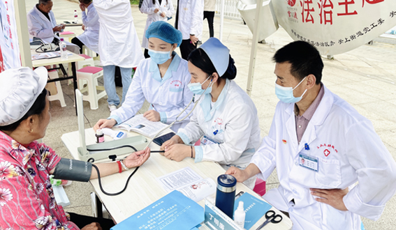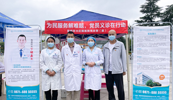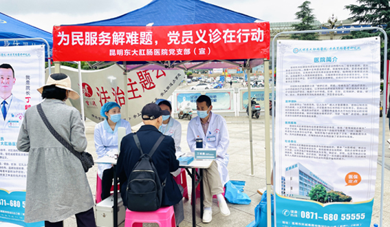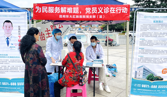 6月24日上午,昆明市“春城党建新力量•红色义诊”第二场义诊活动在福德地铁站B出口法制广场举行,由昆明东大肛肠医院等多家医院医护人员组成的,党员志愿者义诊服务队为市民进行现场义诊。