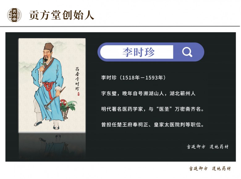 明神宗万历十八年(1590年),致力于对药物考察研究的李时珍,秉着“药食同源、本草养生”的理念,为将,御用的本草养生秘方发扬光大、造福世人,创立了“时珍贡方堂”。