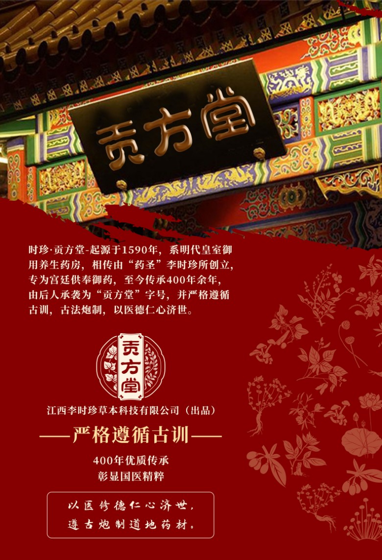 2019年,李时珍后人为了把历经数百年悠久历史的草本秘方宝贵财富传承下去,决定将其经典草本秘制养生秘方结合现代医学科技改良重塑,继续承袭“贡方堂”字号。