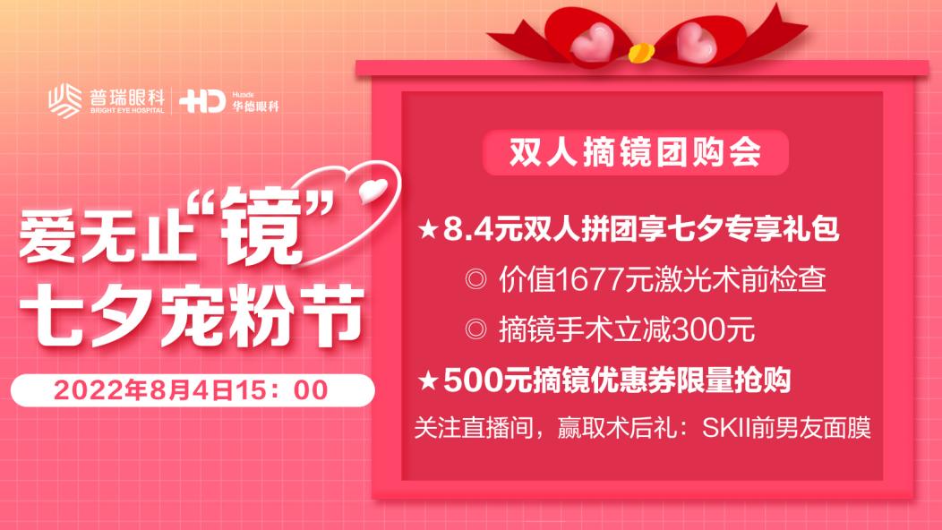 8月4日下午15:00还将开启线上七夕直播专场,本场直播不仅邀请北京华德眼科医院副院长郑惠院长现身直播间,和大家一起聊聊近视矫正那些事,还将有机会对话专家,更有摘镜手术优惠限量团购活动。锁定华德眼科美团直播间,SKII面膜术后好礼等您来抢。