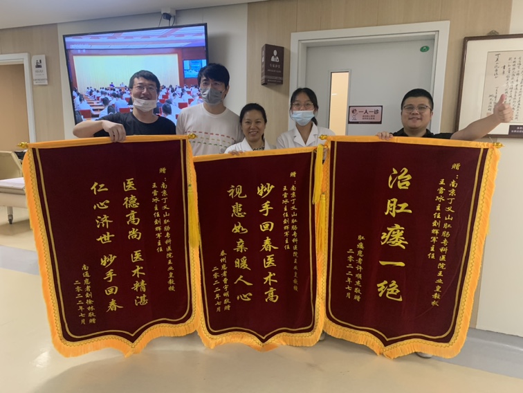 近日,南京丁义山专科医院(肛肠|胃肠)再次上演暖心的一幕。患者刘先生将一面印有“医德高尚、医生精湛、仁心济世、妙手回春”的锦旗送到王雪冰主任手中,另外以为许先生将另一面印有“治肛瘘一绝”的锦旗送给王雪冰主任与刘辉军主任,,一名来自泰州的曹先生将“妙手回春医术高、视患如亲暖人心”送到三楼治疗区全体医护人员的手中,以感谢这些医护人员对他的精心治疗和热心关怀。