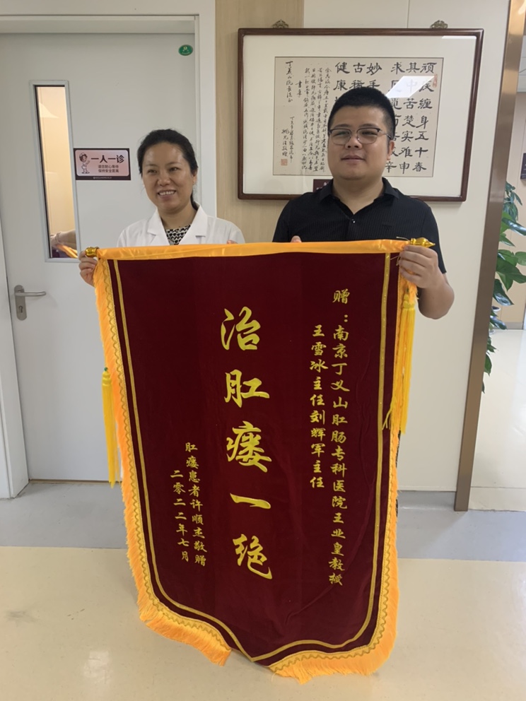 许先生因为肛瘘,身体与身心都受到很大的伤害,也是在机缘巧合下,许先生听从了刘先生的建议,抱着试试看的态度到南京丁义山专科医院进行治疗,出乎许先生的意料,丁义山专科医院彻底解决了他的肛瘘问题,于是激动的许先生为王雪冰主任送上了“治肛瘘一绝”的锦旗。