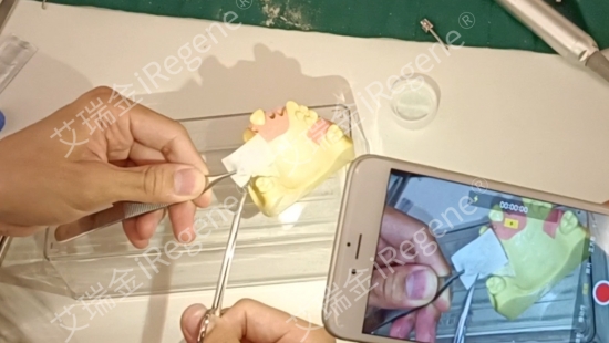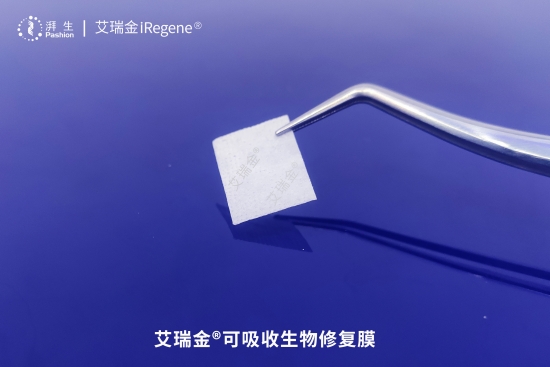 冯楠老师强调,在GBR骨增量中要注意生物屏障膜需要完全封闭骨缺损区,阻止结缔组织细胞进入将要发生骨再生的区域和促进成骨的作用。艾瑞金可吸收生物修复膜采用全新去端肽技术,具有更彻底去除免疫原性;致密层和疏松层的双层结构设计更利于成骨细胞生长;柔韧、强贴服性可应用于全口位置;长达3个月屏障保护时间等特点,在GBR中能够有效起到引导组织再生的作用。