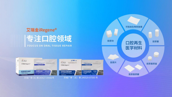艾瑞金-口腔业务线植根于口腔修复再生材料领域,已推出三项三类高端医疗器械产品:具有更彻底去除免疫原性、清晰双层结构、柔韧强贴服性、长达3个月屏障保护时间、有效引导组织再生、实现屏障和隔离功能的艾瑞金可吸收生物修复膜;快速止血、促使软组织再生、预防骨吸收和预防感染的艾瑞金胶原蛋白海绵系列产品,及具有更低免疫原性、良好生物相容性、良好亲水性和可塑性、天然三维多孔结构、3-6个月稳定成骨,成骨密度高等优势的艾瑞金骨植入材料。同时还推出了艾瑞金口腔抑菌凝胶、创口贴、创口贴(口腔溃疡)、口腔抑菌喷剂、口腔抑菌含漱液、牙菌斑指示剂、口腔抑菌膏等数十款口腔科的护理系列产品,可被广泛应用于各种口腔手术的术前检查、抑菌及手术治疗、和术后创口护理等,服务整个口腔修护全周期!