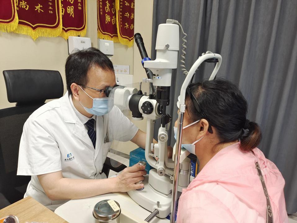 福州爱尔眼科医院眼底病科郑宏华主任为郭阿姨检查