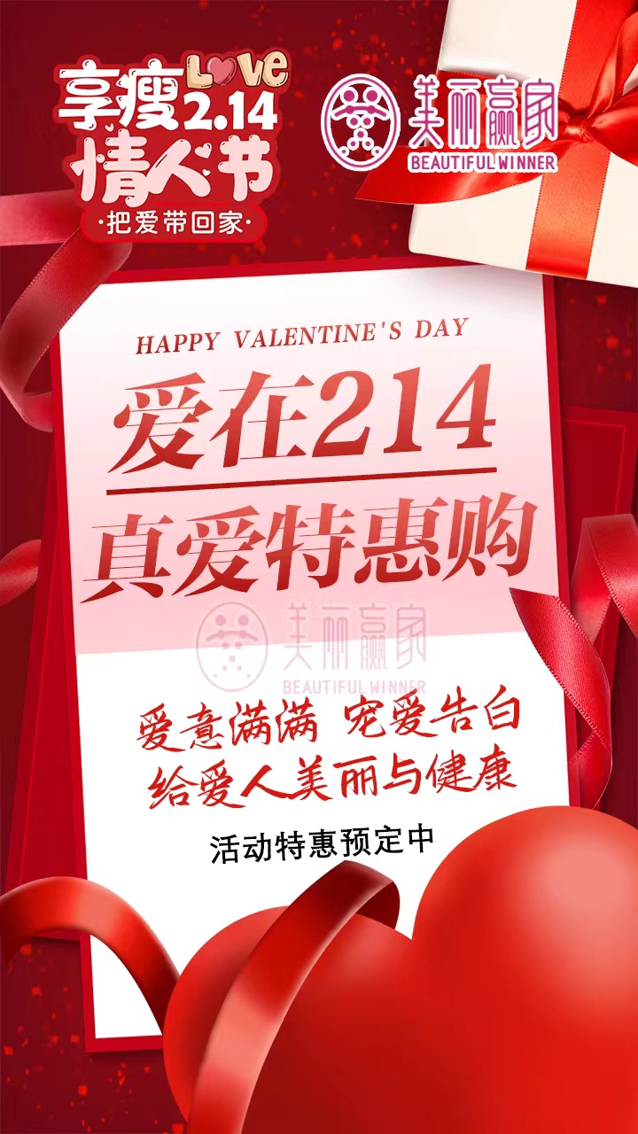 情人节临近,美丽赢家也特别为新老用户推出了“享瘦情人节,把爱带回家”主题优惠活动,2023年2月12-14日期间,美丽赢家旗下多款明星产品及服务均参与活动,多买多送,超值好礼享不停。