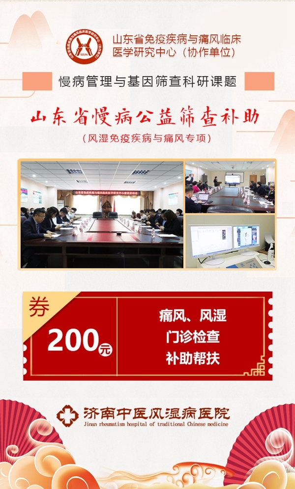 2023年山东省免疫疾病与痛风临床医学研究中心(协作单位)拟立项慢病管理与基因筛查科研课题,遂在2022年2月1日—28日面向社会征集痛风、风湿疾病患者,针对患者基因影响、遗传因素和生活因素进行大数据采样分析并形成数据报告。患者征集期间协作单位还将为痛风、风湿疾病患者提供200元/人门诊检查补助帮扶。