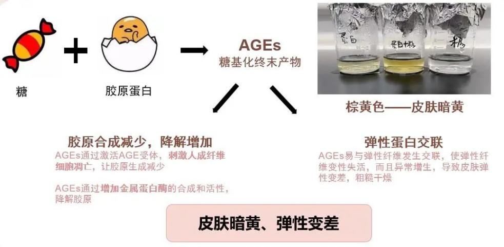 糖化,是身体吸收的糖分附着在蛋白质上,结合生成“糖基化终末产物(AGEs)”。