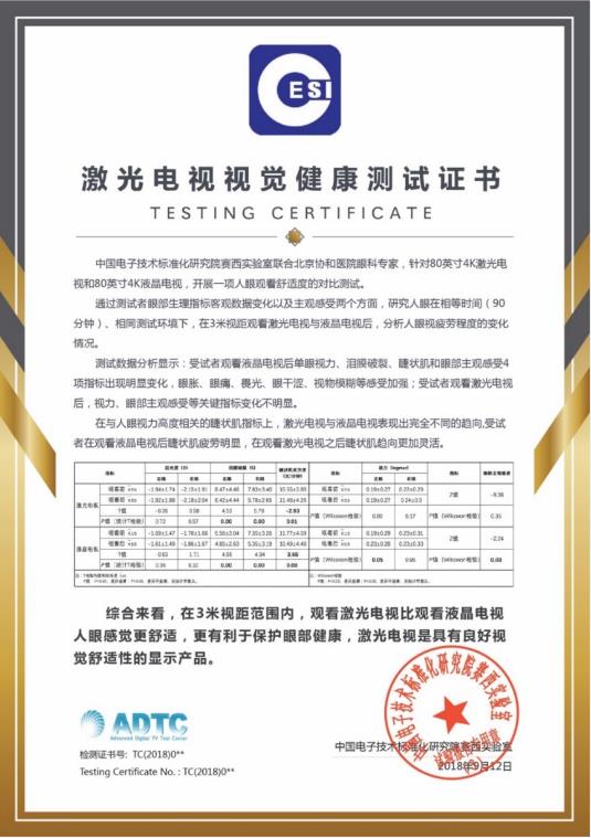 目前我国近视患者接近7亿,青少年近视率高居全世界第一,近视已经成为全社会关注的问题。手机、电脑、电视等电子产品的使用,成为防控近视的着力点。在这样的背景下,2019年,中国电子技术标准化研究院赛西实验室和北京协和医院眼科专家团队,进行了一次电子产品视觉健康测试的课题研究。专家进行144组测试数据严格对比后证实:长时间观看液晶电视眼睛会产生一定的眼胀、眼痛、畏光、眼干涩、视物模糊等症状;而观看激光电视没有明显的视力变化和眼部不适感受,视觉舒适度好,更有利于保护眼部的健康。