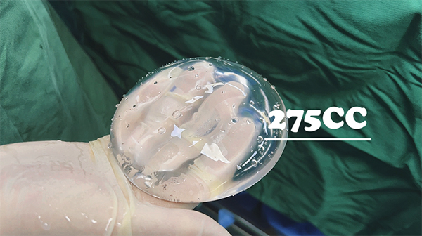 第二台手术的求美者胸廓较窄,同样存在双侧大小、高低不对称的问题。不同的是她的双侧乳头、下皱襞在同一水平线上,无需进行特殊调整,根据测量数据适合的假体型号为光面圆形275CC。她的个人意愿是想要和小姐妹植入同样型号的假体——295CC,同时想要达到上极饱满的效果,但由于她的软组织覆盖情况较差,皮肤肌肉紧实,强行植入过大假体,术后会存在假体显形,边缘感清晰的问题,同时会增加包膜挛缩的风险。