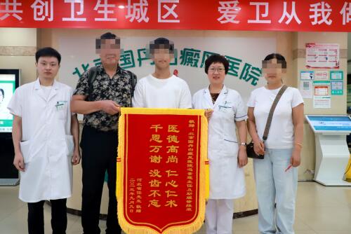 经过一段时间由内而外、个性化治疗,孩子病情得到明显控制,逐渐稳定,长出黑色素,特别是面部白斑复色明显。一家人十分激动,特意趁周末赶到北京国丹白癜风医院,用送锦旗方式表达对冯素莲主任和医生们的感谢。
