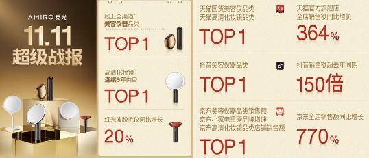 数据显示,2022年AMIRO觅光整体年销售额超过20亿,其中双11期间,AMIRO觅光全渠道销售额超上年同期10倍,不仅增长速度远超同行,更一举拿下天猫、抖音、京东、快手等电商平台全渠道美容仪品类,的位置。