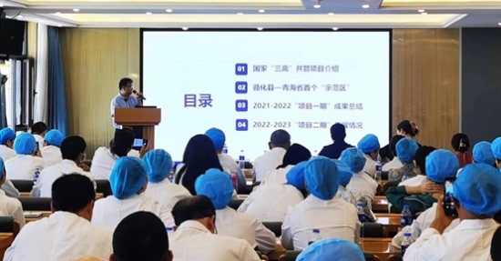 会议由由万众益心三高共管项目负责人王赞斌主持,循化县县人民医院党委书记祁晓宝出席并讲话。祁书记指出,当前循化“三高”慢病患者数量呈持续增长趋势,慢病防控已成为社会高度关注的重大公共卫生问题。针对高血压、高血糖、高脂血症高发的现状,循化县卫生健康委认真贯彻落实国家和省级基层卫生健康有关部署,由国家高血压专病医联体提供技术指导、中再集团帮扶资金支持、循化县人民医院组织实施的循化县三高共管项目实施三年来,以基层慢性病管理为突破口,统筹推进基层医疗、医保和医药改革经验做法,患者血压测量率由50%提升到65%、血压达标率由30%提升到60%(远高于全国基层18%达标率水平)。项目二期我们由1500人增加到5000人,我们管理的难度在提升,基层医生要付出的精力也会增加,积极推进“三高共管”慢性病综合防治,科学助力健康老龄化,应,从以下四个方面着手:一是通过多渠道、多层次、全方位开展“三高共管”全民健康教育;二是强化“三高”慢性病筛查和早期发现,实现高血压、糖尿病患者管理干预全覆盖;三是全面借助物联网设备+大数据中心监测预警+互联网远程管理技术,实现院外一体化管理的协调模式,积极开展“三高共管”促进行动;四是充分发挥循化医共体独特优势,推广适宜技术,提高基层医疗“三高共管”服务能力。