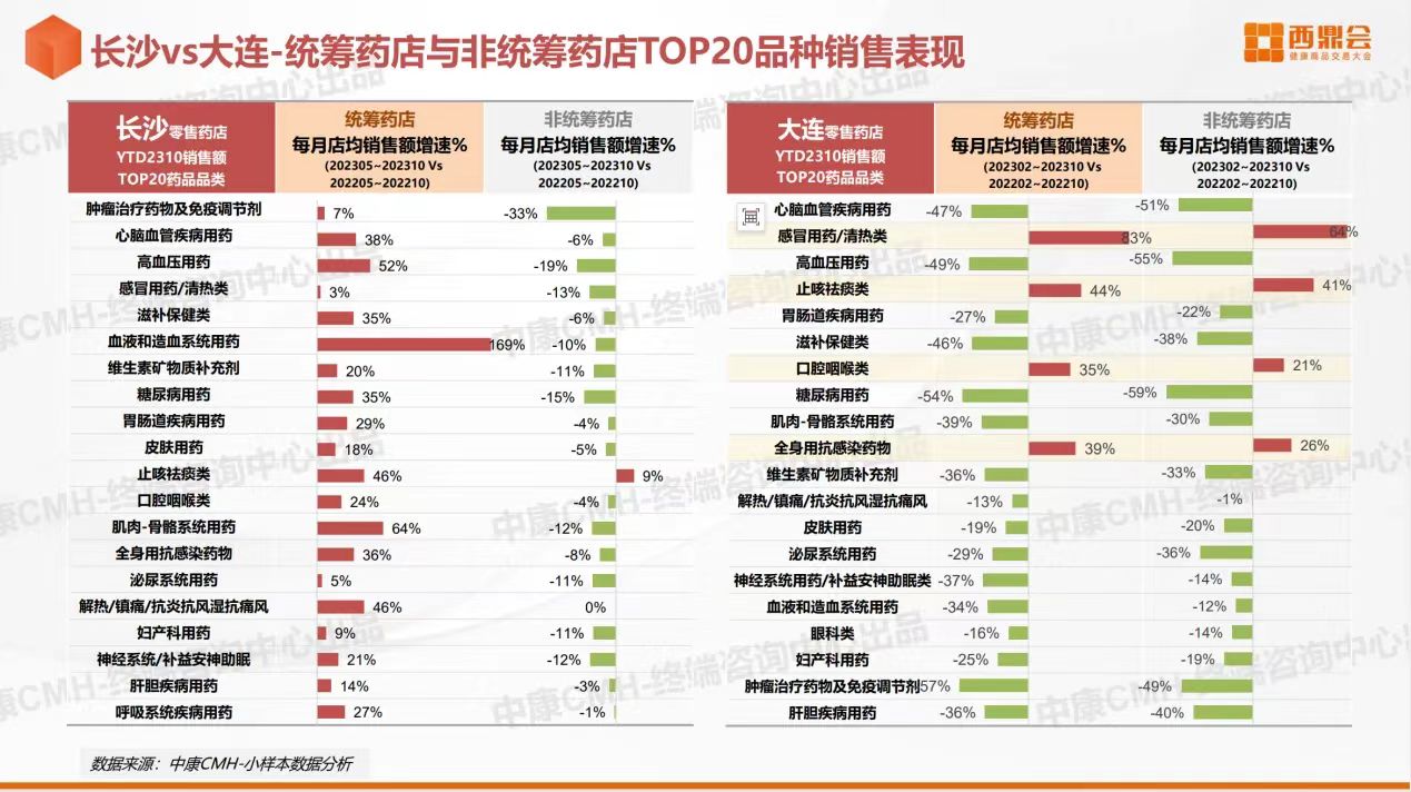 具体到细分品类来看,中康CMH数据显示,长沙统筹药店TOP20各个品类增长尤为明显。而大连药店无论是否为统筹药店,因为处方获取难度加大,以至于院外数据都出现不同程度下滑,仅有部分与流感相关的品类在这种环境下仍有正向增长。