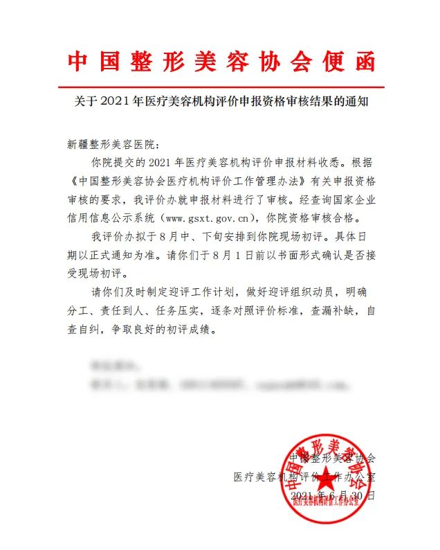 ★新疆整形美容医院收到中国整形美容协会参评通知函