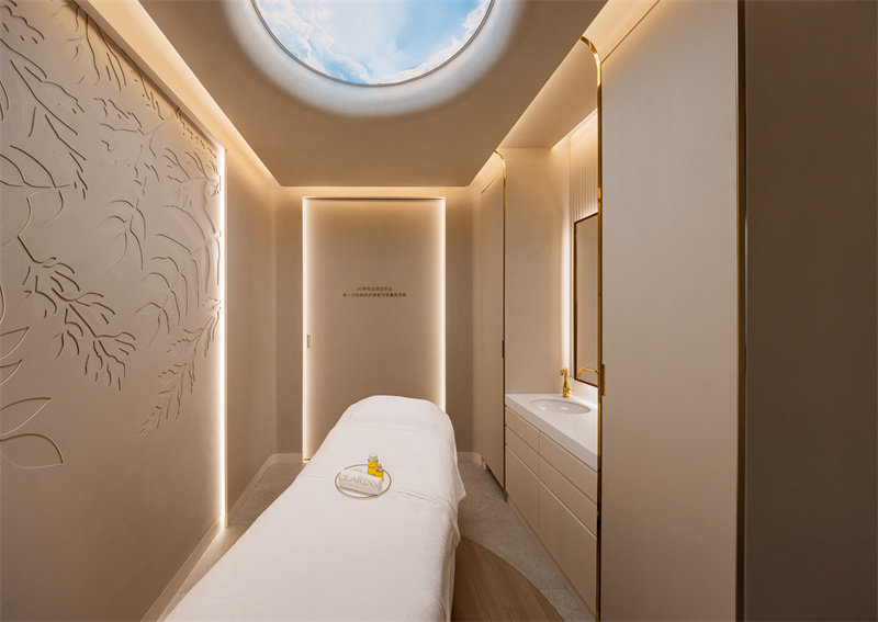娇韵诗美妍中心上海静安嘉里中心店设有六间私享护理间,从精致的环境布置到个性化的护理方案,每一处细节都展现着娇韵诗对美的不懈追求和严苛标准。在专属的疗愈空间里,专业精湛的法式护理技艺、植物精萃的美妍配方、定制化的面部与身体护理方案,触启无龄之美,唤启崭新五感体验。全新娇韵诗豪华芳疗室顶部饰以蔚蓝天空,沉浸享受疗愈体验的同时,仰望蓝天,宛若置身于自然旷野,从而达到身心的和谐与平衡,获得放松、宁静的心境。和缓的音乐静静回响,帮助情绪得到进一步放松和安抚。