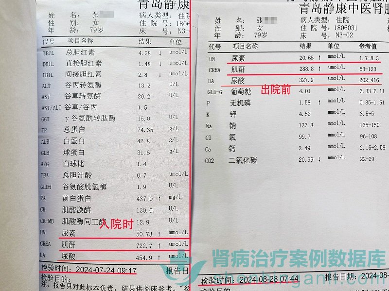 血肌酐降至288.8umol/L,成功远离透析标准,尿素降至20.65mmol/L,尿酸降至327.9umol/L,达到正常水平,血红蛋白升至111g/L,贫血改善,指标正常。饮食、睡眠及其他不适情况好转,尿量恢复正常。