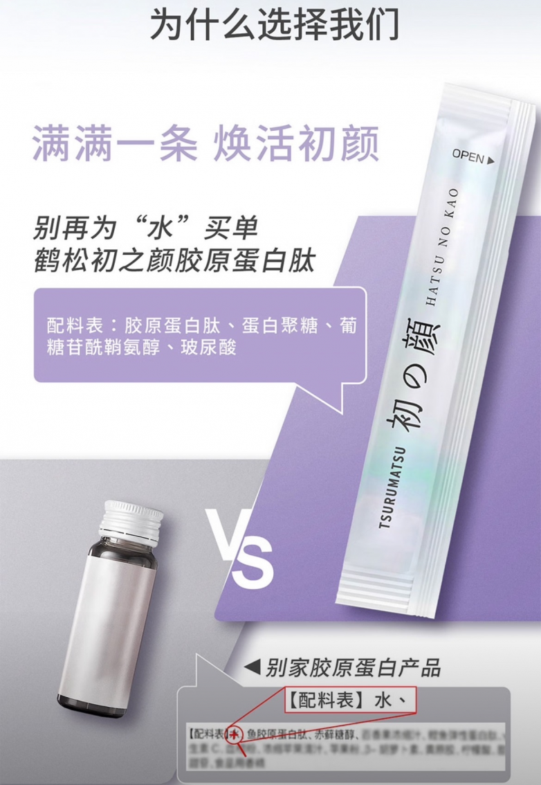 日本鹤松胶原蛋白肽初之颜选用来自北冰洋深海鳕鱼提取的微分子鱼胶原蛋白肽,搭载新一代Peptide Flow+技术精细水解,使分子量稳定在1000~2000道尔顿之间,具有优良的活性和吸收效率。此外,配方中加入了蛋白聚糖、小分子玻尿酸、葡糖苷酰鞘氨醇等协同成分,帮助皮肤从锁水保湿、弹性支撑、细胞再生多个维度得到提升。