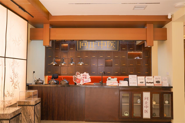 诊所空间设计处处体现中医文化精髓。前台每日奉上定制养生药茶,践行“治未病”理念。诊室以“木、火、土、金、水”五行命名,寓意服务如五行运转般循环不息、温暖有情。一层设有针灸治疗区,二层为诊室。