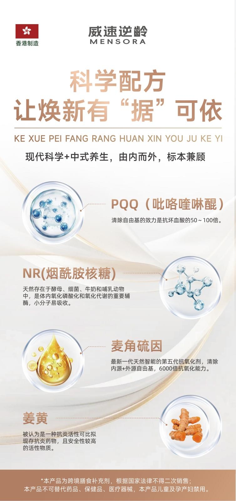 威速逆龄 ®,不仅是、膳食补充剂,更是您健康生活的贴心伙伴。我们始终秉持科学、严谨的态度,从成分甄选到品质把控,每一个细节都力求做到,,愿以科学的营养支持,陪伴您更从容地享受健康、高品质的生活。