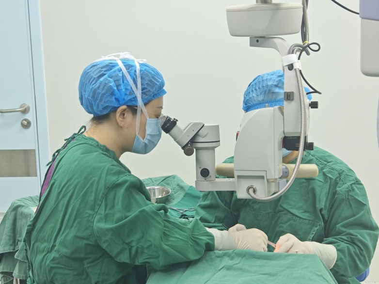 在完善术前各项检查、排除手术禁忌并做好充分准备后,余新平教授为小熊制定了个性化手术方案,实施 “双眼外直肌后徙 8mm + 左眼内直肌缩短 7mm” 手术。整个手术过程在专业医疗团队的配合下有条不紊地进行,最终顺利完成,术中无任何并发症发生。