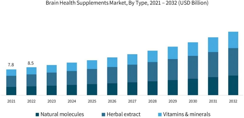 脑健康需求的全面觉醒,正在催生一个庞大市场。Global Market Insight 数据显示,2023 年全球大脑健康补充剂市场规模已达 92 亿美元,预计 2032 年将增长至 193 亿美元,年复合增长率超 8.2%。根据博研咨询《2025 年中国大脑健康解决方案行业报告》显示,2024 年 “改善记忆” 类保健品作为热门细分赛道,市场规模已突破460亿,2025 年增速预计达 13%。