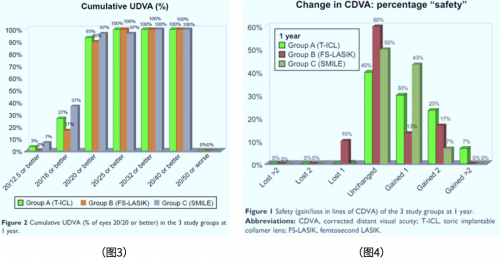 与其他术式相比,ICL术后的有效性、安全性表现优异。印度的Sheetal Brar教授对比三种术式(TICL组、 FS-LASIK组和SMILE组,每组n=30,平均SE<-6D) 7,术后1年,三组UDVA等于或优于20/20的占比分别为93%、90%和97%,有效性指数分别为1.12、1.02和1.06,TICL组有效指数,。(图3)三组CDVA增加一行及以上的百分比分别为 60%、40%、50%,安全性指数分别为1.24、1.11和1.15,TICL组安全指数,。(图4)
